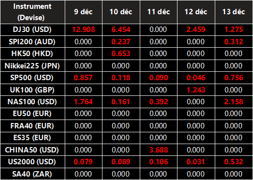 Veuillez noter que les dividendes des CFDs sur indices suivants seront ajustés en fonction des dates ex-dividende à venir. Le commentaire pour la négociation des CFDs sur indice sera dans le format suivant “Div&<Nom du produit>&<Volume net>” qui apparaît dans le solde après la clôture du jour précédant la date de paiement du dividende.