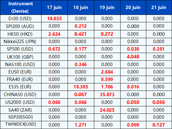 Veuillez noter que les dividendes des CFDs sur indices suivants seront ajustés en fonction des dates ex-dividende à venir. Le commentaire pour la négociation des CFDs sur indice sera dans le format suivant “Div&<Nom du produit>&<Volume net>” qui apparaît dans le solde après la clôture du jour précédant la date de paiement du dividende.
