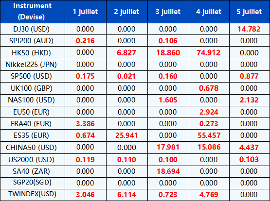 Veuillez noter que les dividendes des CFDs sur indices suivants seront ajustés en fonction des dates ex-dividende à venir. Le commentaire pour la négociation des CFDs sur indice sera dans le format suivant “Div&<Nom du produit>&<Volume net>” qui apparaît dans le solde après la clôture du jour précédant la date de paiement du dividende.