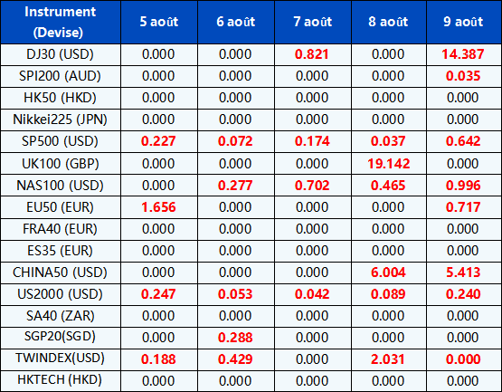 Veuillez noter que les dividendes des CFDs sur indices suivants seront ajustés en fonction des dates ex-dividende à venir. Le commentaire pour la négociation des CFDs sur indice sera dans le format suivant “Div&<Nom du produit>&<Volume net>” qui apparaît dans le solde après la clôture du jour précédant la date de paiement du dividende.