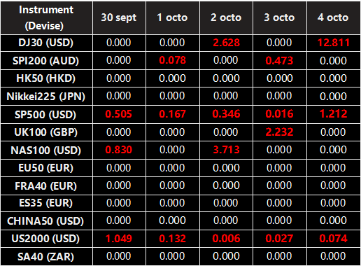 Veuillez noter que les dividendes des CFDs sur indices suivants seront ajustés en fonction des dates ex-dividende à venir. Le commentaire pour la négociation des CFDs sur indice sera dans le format suivant “Div&<Nom du produit>&<Volume net>” qui apparaît dans le solde après la clôture du jour précédant la date de paiement du dividende.