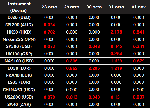 Veuillez noter que les dividendes des CFDs sur indices suivants seront ajustés en fonction des dates ex-dividende à venir. Le commentaire pour la négociation des CFDs sur indice sera dans le format suivant “Div&<Nom du produit>&<Volume net>” qui apparaît dans le solde après la clôture du jour précédant la date de paiement du dividende.