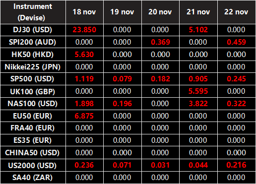 Veuillez noter que les dividendes des CFDs sur indices suivants seront ajustés en fonction des dates ex-dividende à venir. Le commentaire pour la négociation des CFDs sur indice sera dans le format suivant “Div&<Nom du produit>&<Volume net>” qui apparaît dans le solde après la clôture du jour précédant la date de paiement du dividende.