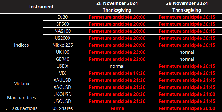 Veuillez noter que les heures de trading et les horaires des sessions de marché des instruments suivants seront affectés par les prochaines fêtes de Thanksgiving.