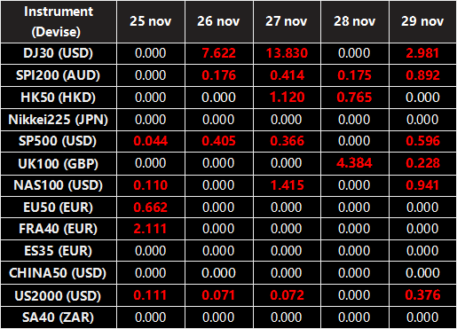 Veuillez noter que les dividendes des CFDs sur indices suivants seront ajustés en fonction des dates ex-dividende à venir. Le commentaire pour la négociation des CFDs sur indice sera dans le format suivant “Div&<Nom du produit>&<Volume net>” qui apparaît dans le solde après la clôture du jour précédant la date de paiement du dividende.