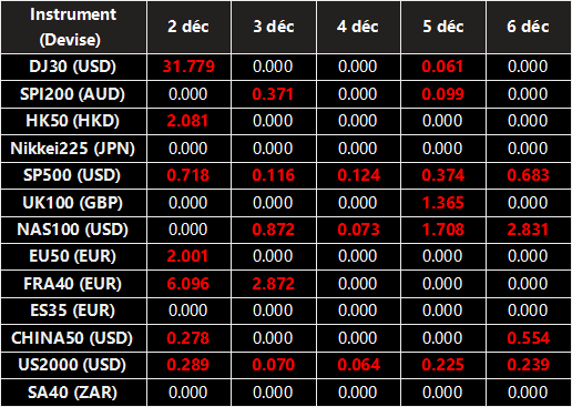 Veuillez noter que les dividendes des CFDs sur indices suivants seront ajustés en fonction des dates ex-dividende à venir. Le commentaire pour la négociation des CFDs sur indice sera dans le format suivant “Div&<Nom du produit>&<Volume net>” qui apparaît dans le solde après la clôture du jour précédant la date de paiement du dividende.