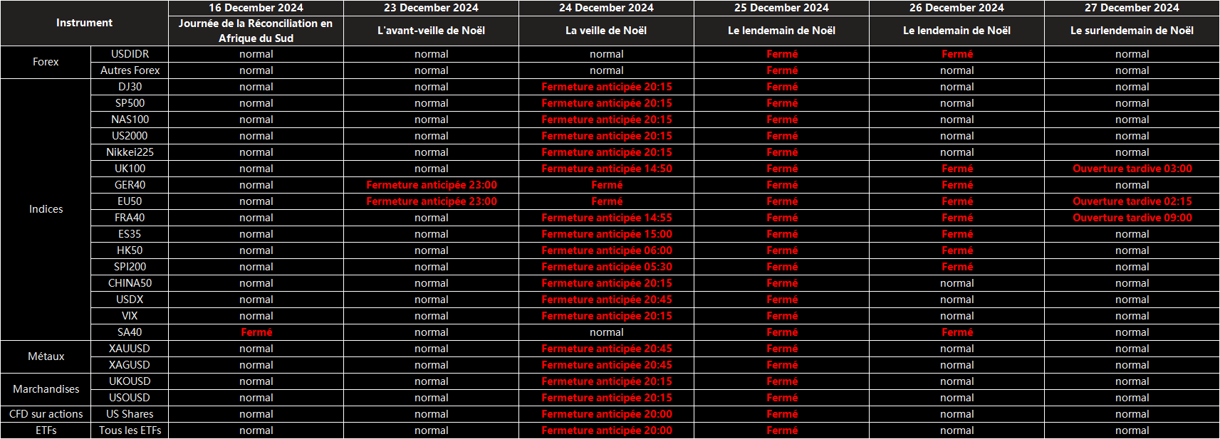 Veuillez noter que les heures de négociation des instruments suivants et les heures des séances de marché seront affectées par les prochains congés de décembre.