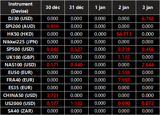 Veuillez noter que les dividendes des CFDs sur indices suivants seront ajustés en fonction des dates ex-dividende à venir. Le commentaire pour la négociation des CFDs sur indice sera dans le format suivant “Div&<Nom du produit>&<Volume net>” qui apparaît dans le solde après la clôture du jour précédant la date de paiement du dividende.