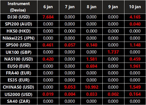 Veuillez noter que les dividendes des CFDs sur indices suivants seront ajustés en fonction des dates ex-dividende à venir. Le commentaire pour la négociation des CFDs sur indice sera dans le format suivant “Div&<Nom du produit>&<Volume net>” qui apparaît dans le solde après la clôture du jour précédant la date de paiement du dividende.
