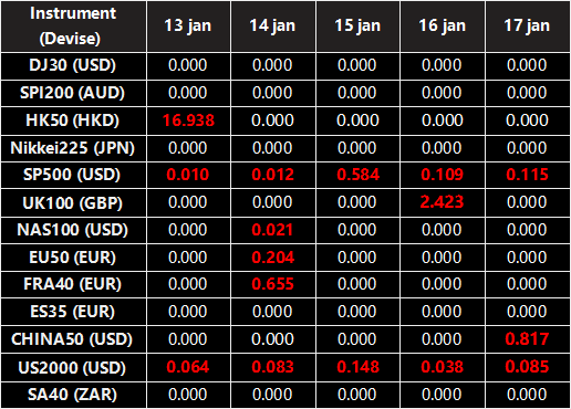 Veuillez noter que les dividendes des CFDs sur indices suivants seront ajustés en fonction des dates ex-dividende à venir. Le commentaire pour la négociation des CFDs sur indice sera dans le format suivant “Div&<Nom du produit>&<Volume net>” qui apparaît dans le solde après la clôture du jour précédant la date de paiement du dividende.