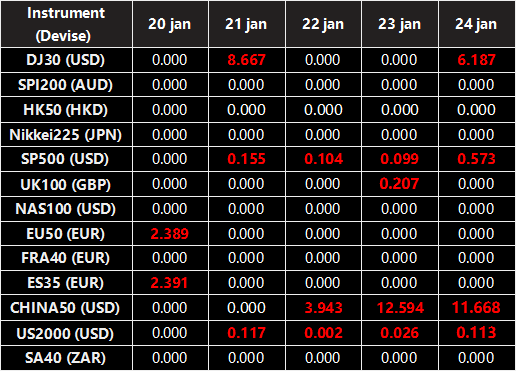 Veuillez noter que les dividendes des CFDs sur indices suivants seront ajustés en fonction des dates ex-dividende à venir. Le commentaire pour la négociation des CFDs sur indice sera dans le format suivant “Div&<Nom du produit>&<Volume net>” qui apparaît dans le solde après la clôture du jour précédant la date de paiement du dividende.