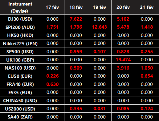 Veuillez noter que les dividendes des CFDs sur indices suivants seront ajustés en fonction des dates ex-dividende à venir. Le commentaire pour la négociation des CFDs sur indice sera dans le format suivant “Div&<Nom du produit>&<Volume net>” qui apparaît dans le solde après la clôture du jour précédant la date de paiement du dividende.
