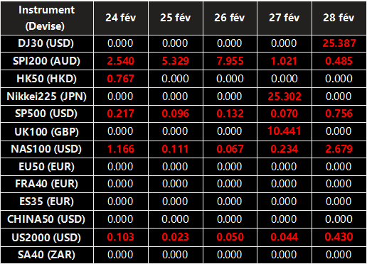 Veuillez noter que les dividendes des CFDs sur indices suivants seront ajustés en fonction des dates ex-dividende à venir. Le commentaire pour la négociation des CFDs sur indice sera dans le format suivant “Div&<Nom du produit>&<Volume net>” qui apparaît dans le solde après la clôture du jour précédant la date de paiement du dividende.