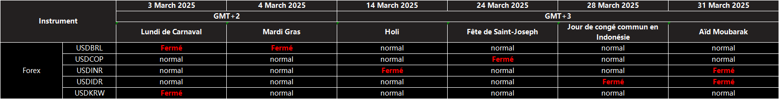Veuillez noter que les horaires de trading et les heures de session de marché des instruments suivants seront affectés par les par les prochaines vacances de mars.