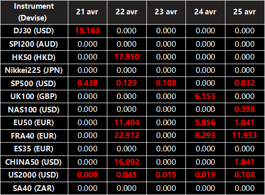 Veuillez noter que les dividendes des CFDs sur indices suivants seront ajustés en fonction des dates ex-dividende à venir. Le commentaire pour la négociation des CFDs sur indice sera dans le format suivant “Div&<Nom du produit>&<Volume net>” qui apparaît dans le solde après la clôture du jour précédant la date de paiement du dividende.