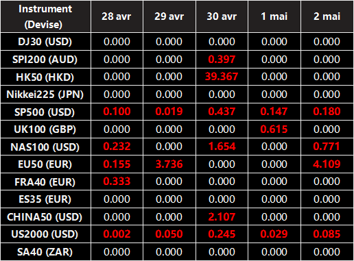 Veuillez noter que les dividendes des CFDs sur indices suivants seront ajustés en fonction des dates ex-dividende à venir. Le commentaire pour la négociation des CFDs sur indice sera dans le format suivant “Div&<Nom du produit>&<Volume net>” qui apparaît dans le solde après la clôture du jour précédant la date de paiement du dividende.