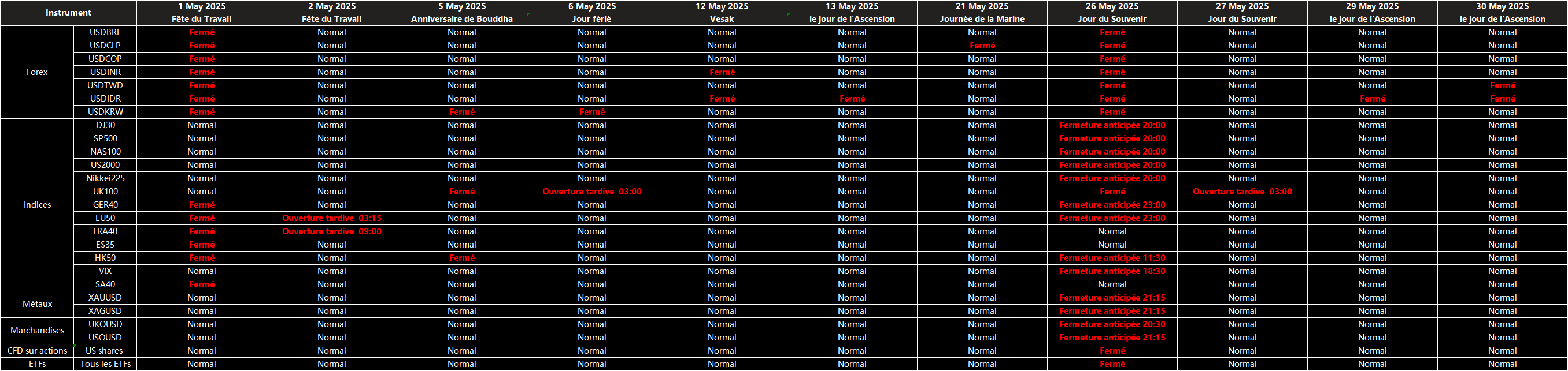 Veuillez noter que les horaires de trading et les heures de session de marché des instruments suivants seront affectés par les par les prochaines vacances de Mai.
