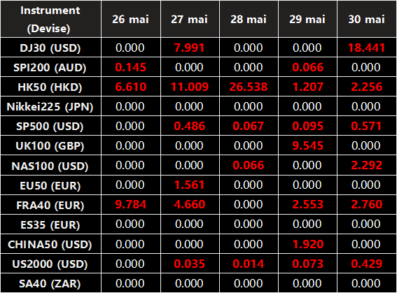 Veuillez noter que les dividendes des CFDs sur indices suivants seront ajustés en fonction des dates ex-dividende à venir. Le commentaire pour la négociation des CFDs sur indice sera dans le format suivant “Div&<Nom du produit>&<Volume net>” qui apparaît dans le solde après la clôture du jour précédant la date de paiement du dividende.