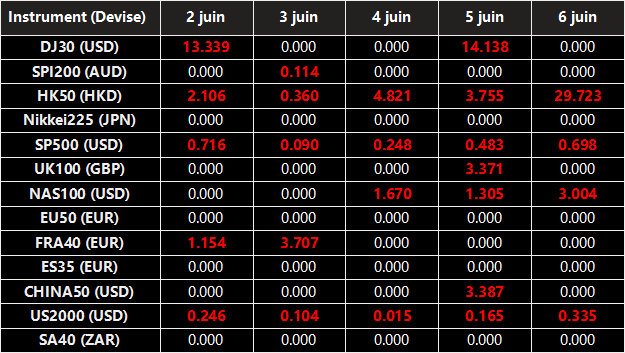 Veuillez noter que les dividendes des CFDs sur indices suivants seront ajustés en fonction des dates ex-dividende à venir. Le commentaire pour la négociation des CFDs sur indice sera dans le format suivant “Div&<Nom du produit>&<Volume net>” qui apparaît dans le solde après la clôture du jour précédant la date de paiement du dividende.