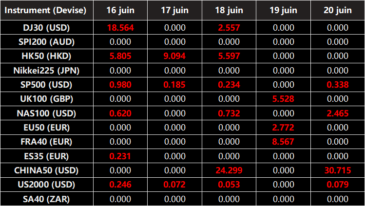 Veuillez noter que les dividendes des CFDs sur indices suivants seront ajustés en fonction des dates ex-dividende à venir. Le commentaire pour la négociation des CFDs sur indice sera dans le format suivant “Div&<Nom du produit>&<Volume net>” qui apparaît dans le solde après la clôture du jour précédant la date de paiement du dividende.