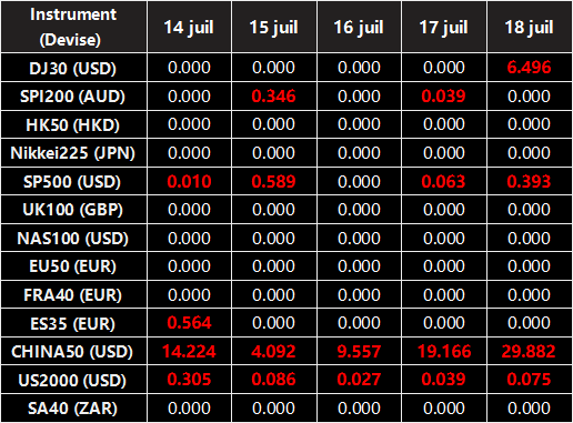 Veuillez noter que les dividendes des CFDs sur indices suivants seront ajustés en fonction des dates ex-dividende à venir. Le commentaire pour la négociation des CFDs sur indice sera dans le format suivant “Div&<Nom du produit>&<Volume net>” qui apparaît dans le solde après la clôture du jour précédant la date de paiement du dividende.