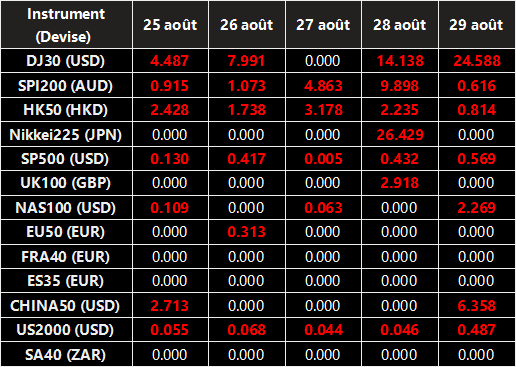 Veuillez noter que les dividendes des CFDs sur indices suivants seront ajustés en fonction des dates ex-dividende à venir. Le commentaire pour la négociation des CFDs sur indice sera dans le format suivant “Div&<Nom du produit>&<Volume net>” qui apparaît dans le solde après la clôture du jour précédant la date de paiement du dividende.
