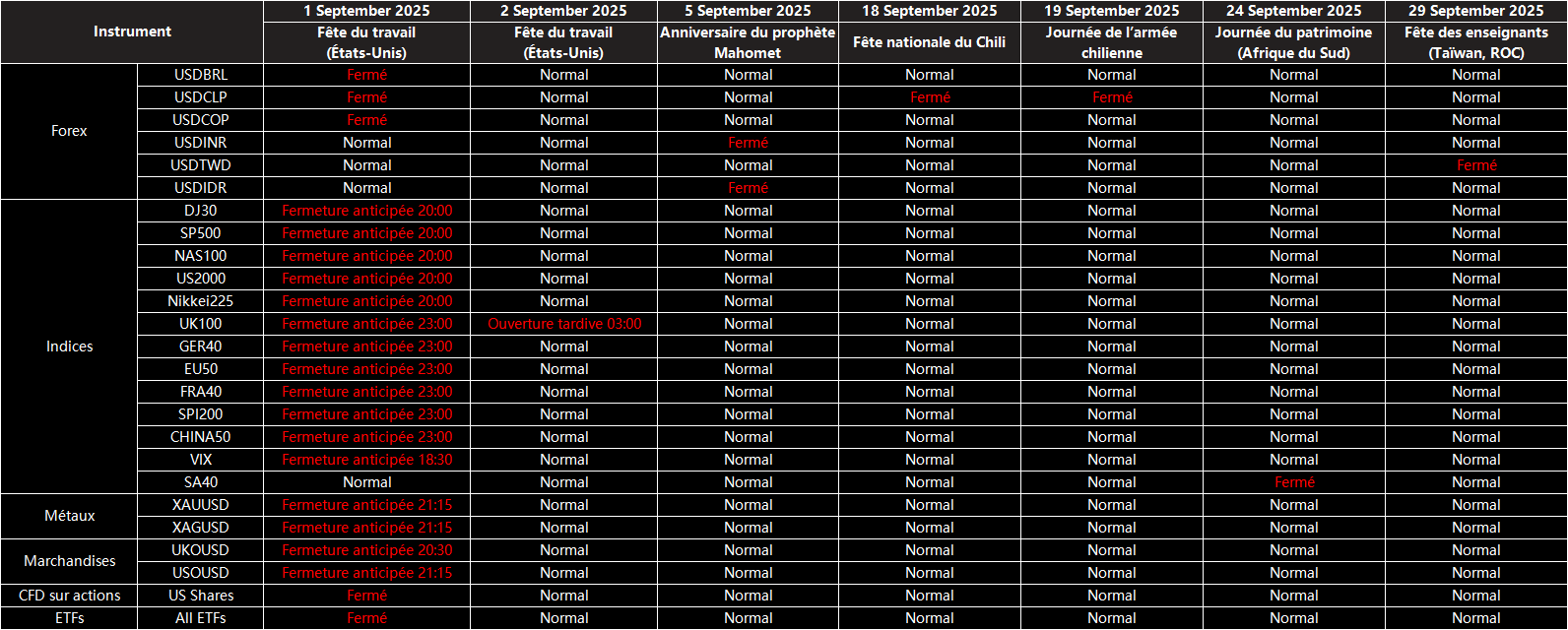 Veuillez noter que les horaires de trading et les heures de session de marché des instruments suivants seront affectés par les par les prochaines vacances de septembre.